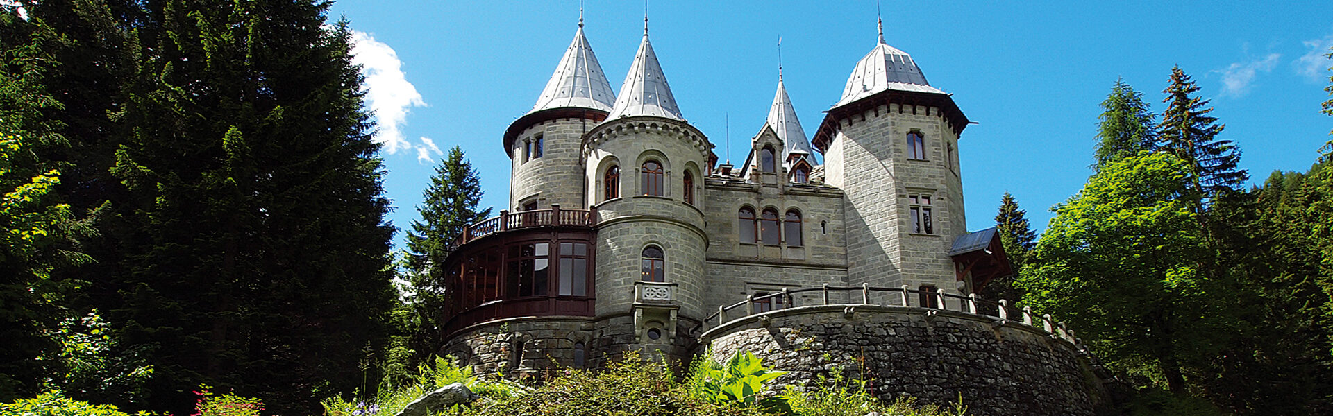 Come nelle favole, le sue bianche torrette aguzze sbucano dal fitto del bosco. La fiaba continua all’interno, in un bizzarro intreccio tra Art Nouveau e Neogotico, dove dominano le margherite, in omaggio alla Regina per cui il castello fu costruito.