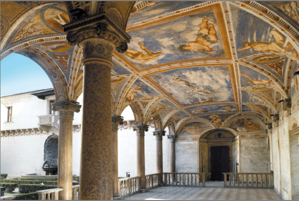All’esterno si presenta come una fortezza medievale severa e imponente, mentre all’interno decorazioni scultoree e pregevoli affreschi gli conferiscono l’aspetto di un’elegante residenza.