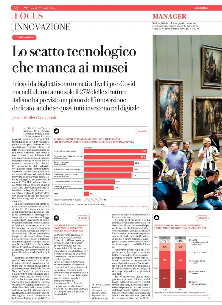 Dall’analisi dell’innovazione nel settore culturale emerge un nuovo attore: il digitale. Dalle esperienze immersive e di realtà aumentata fino ai biglietti dematerializzati; le opportunità sono infinite. Risulta in crescita il numero di musei, monumenti e aree archeologiche che adottano piani strategici dell’innovazione digitale; la strada da percorrere è ancora lunga.