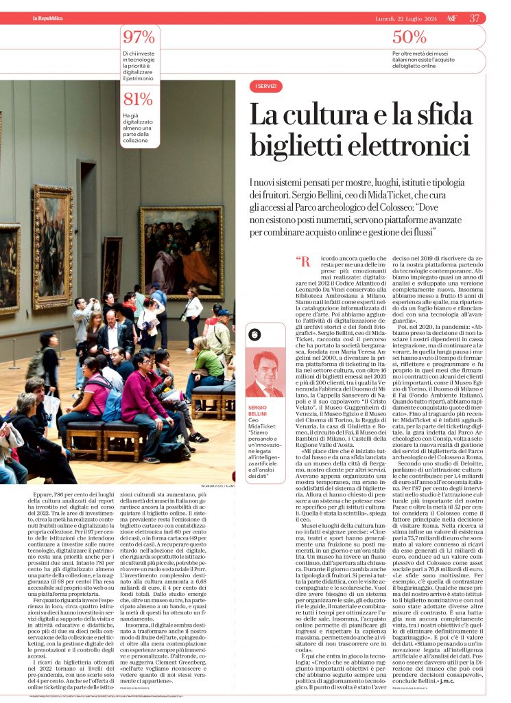 In questo contesto trova posto MidaTicket. Nata nel mondo della catalogazione informatizzata e della digitalizzazione, l’azienda è oggi la prima piattaforma di ticketing in Italia nel settore cultura, con oltre 16 milioni di biglietti emessi nel 2023 e più di 200 clienti.